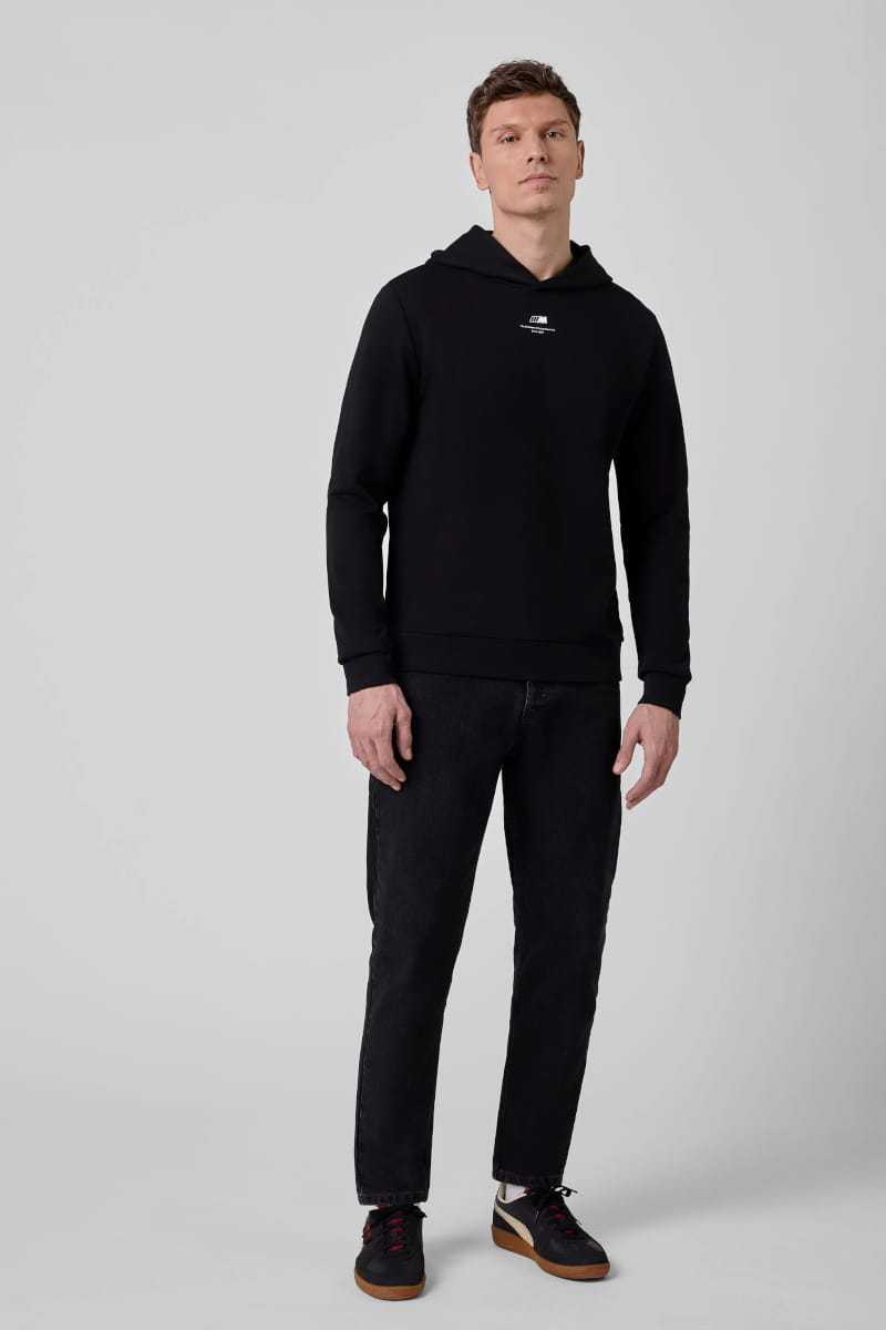 Wygodna i ciepła bluza z kapturem w kolorze głębokiej czerni, z białym subtelnym logiem najmocniejszej litery świata ///M jako manifestacja Twojego przywiązania do marki i jakości którą reprezentuje. Pod logiem znajdziesz najsłynniejsze hasło reklamowe ///M: The Ultimate Driving Machine since 1972 - symbolizujące niebywałe osiągi wynikające z niekwestionowanej jakość BMW.