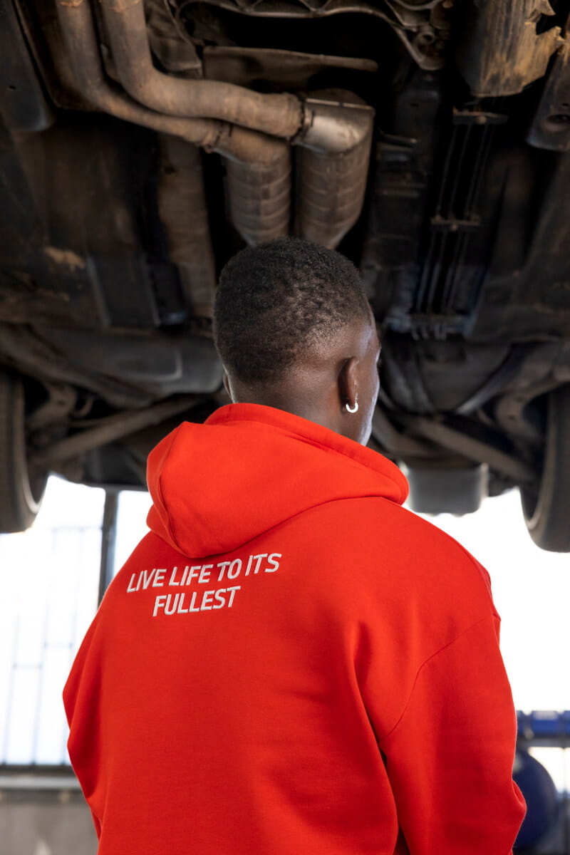 - Hasło inspirowane BMW E30 — „LIVE LIFE TO ITS FULLEST” — w formie trójwymiarowego haftu na plecach