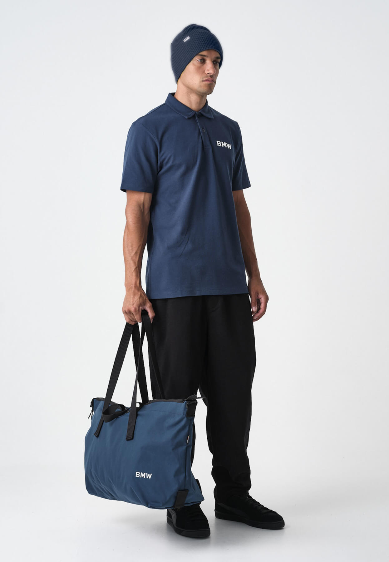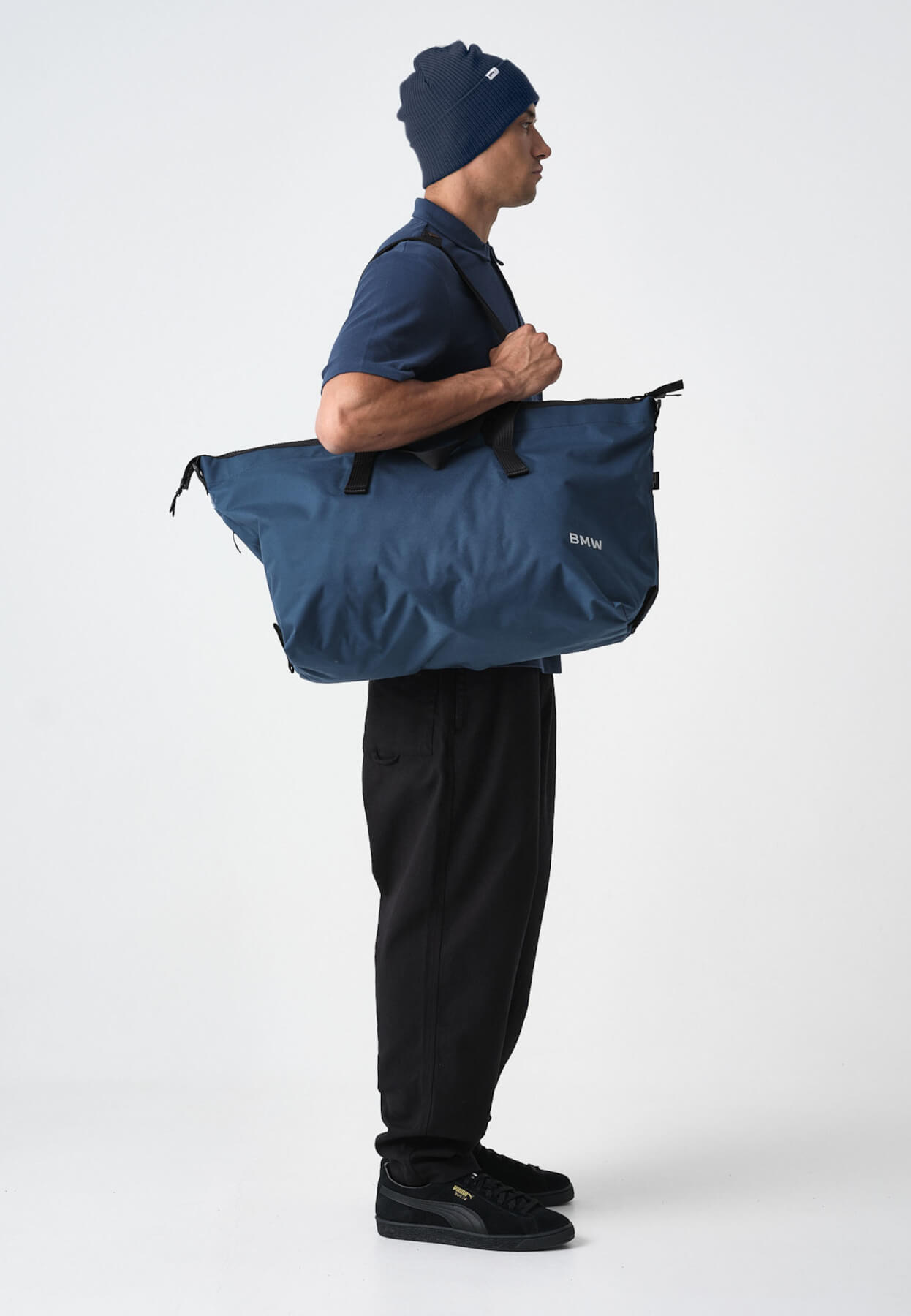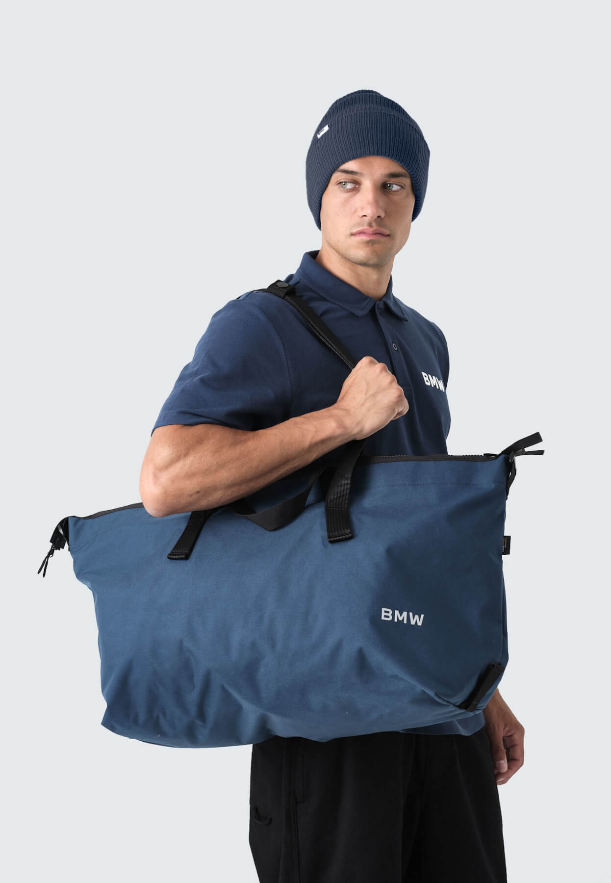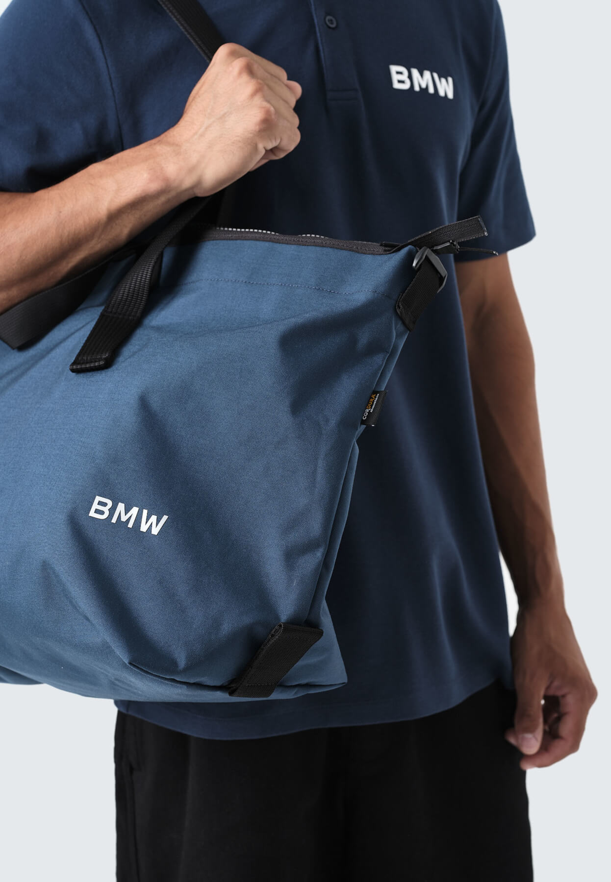Wyraźne, metaliczne logo BMW z trwałego tworzywa sztucznego nadaje całości prestiżowego charakteru, nie zaburzając harmonijnej formy torby.