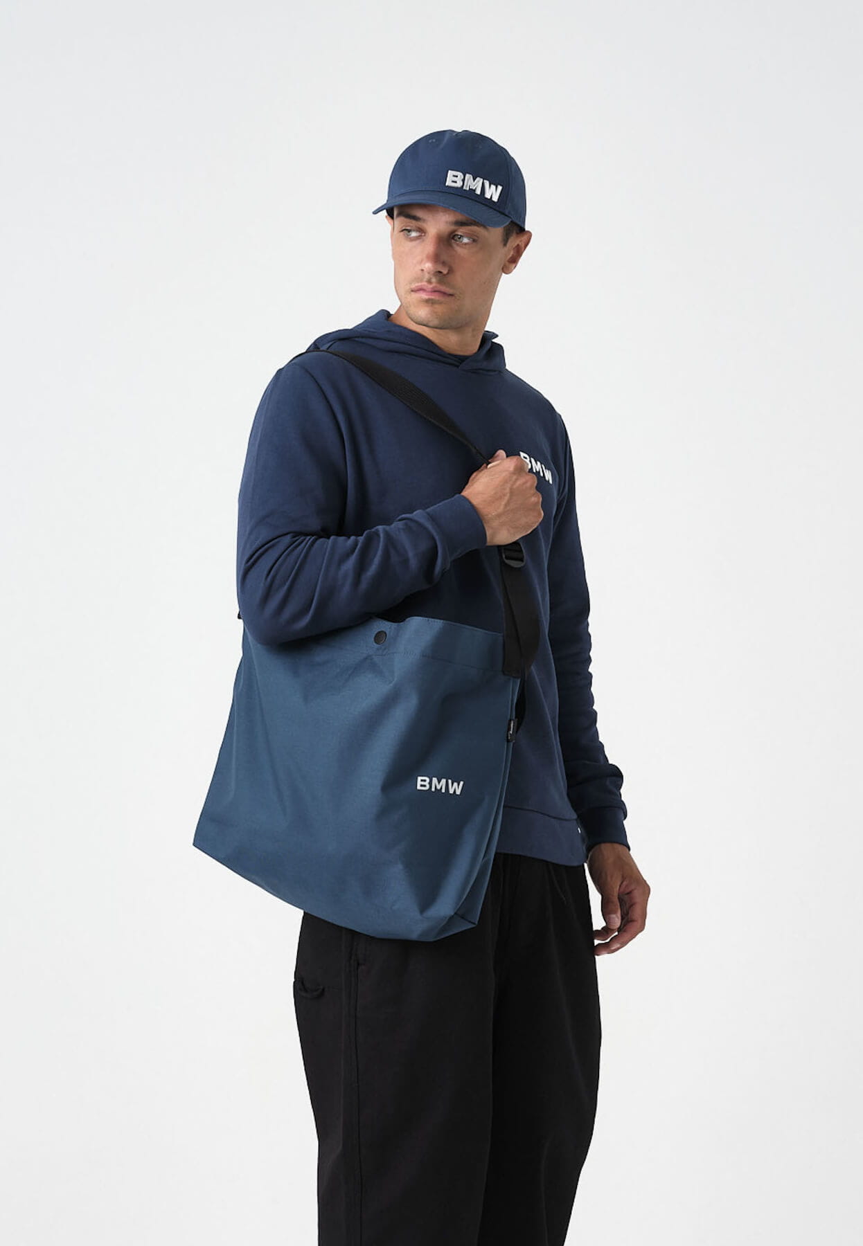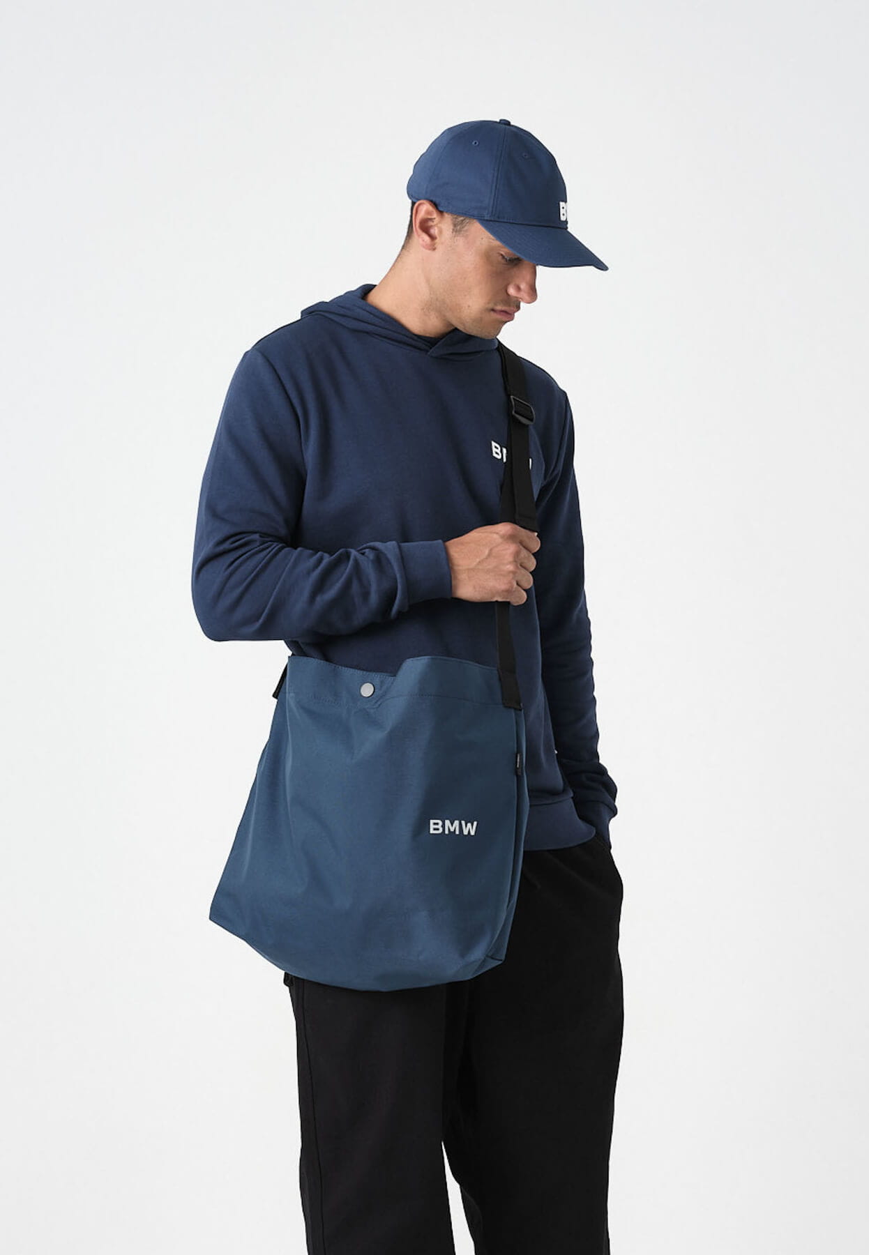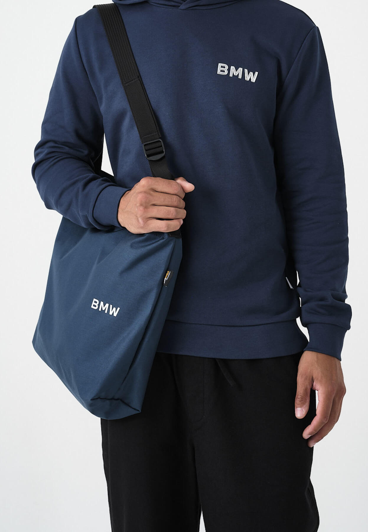 Widoczny metaliczny napis BMW (wykonany z TPU) dodaje całości prestiżowego charakteru, nie przytłaczając harmonijnej formy torby.